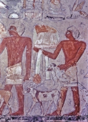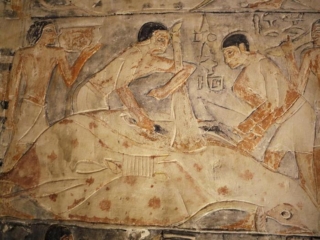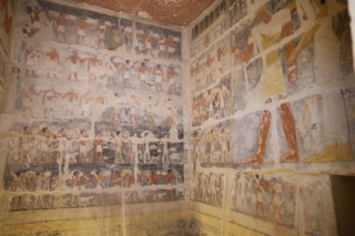 Quella di Mehu è una delle tombe più belle della necropoli di Saqqara, in quanto i suoi colori vividi animano ancora le meravigliose e spesso esclusive rappresentazioni parietali. Tra le scene più inusuali spicca l’unione di due coccodrilli in presenza di una tartaruga, mentre tra le scene più importanti vediamo raffigurato il titolare della tomba esercitare l’arte della caccia e della pesca nelle paludi, scene di raccolto e di danza anche acrobatica: rappresentazioni che a Saqqara non erano mai state raffigurate nelle tombe precedenti la VI dinastia. Favolosa è la sua falsa porta con gli splendidi geroglifici in giallo; per chi scrive, una delle più belle false porte dell’intera necropoli.