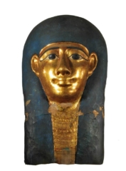 Ad accogliere il visitatore alcune maschere funerarie egizie della collezione Berman, in particolare due esempi di maschere dorate. Osservando questi reperti con attenzione si notano le caratteristiche collane Usekh che consentono un raffronto con l’oreficeria etrusca, non soltanto per una sorta di transfer tecnologico, ma anche e soprattutto per il patrimonio immateriale che lo ha seguito, visibile in elementi iconografici e simbolici.