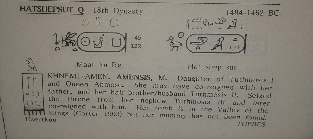 Fig. 1 – Il nome Hatshepsut è il V nome della regina ed è anticipato dal titolo S’-R3 (Figlia del Sole). Il significato di Hatshepsut è La più nobile di tutte le donne. La figura è tratta da un volume di J. Rose, The Sons of Ra: Cartouches of the kings of Egypt, JRT 1985, pag. 91