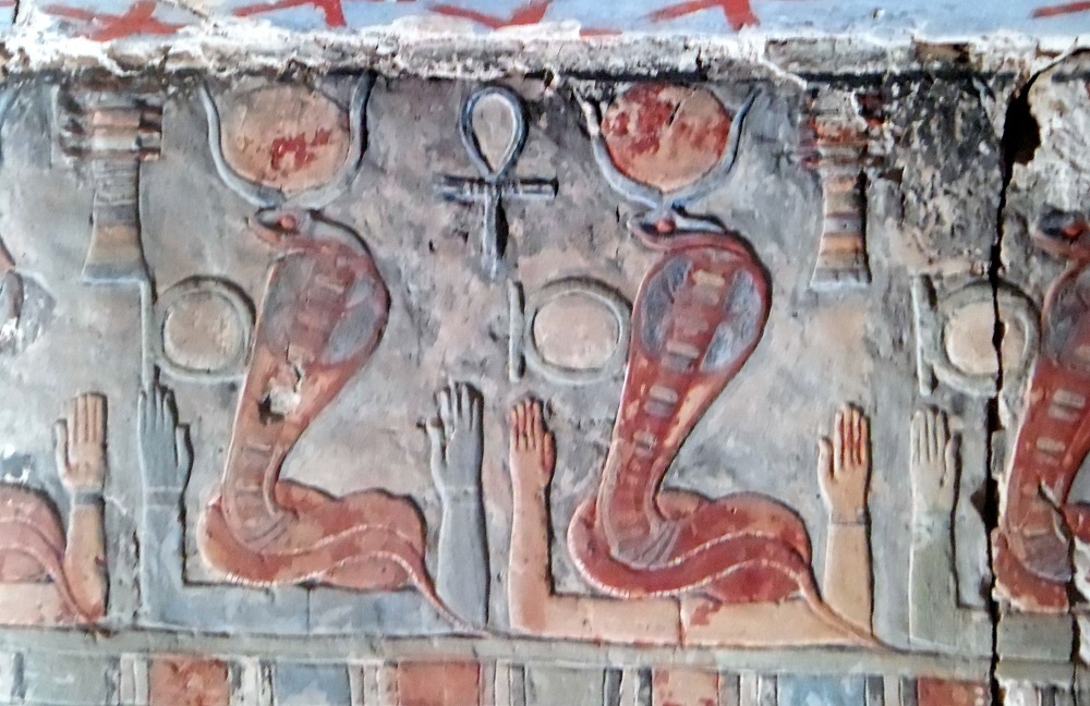 Nel tempio dei milioni di anni della regina-faraone Hatshepsut, a Deir el-Bahari (Luxor), la cappella dedicata alla dea Hathor mostra al suo interno, appena sotto il soffitto, un fregio orizzontale in continuo che mostra due braccia, nella tipica forma del ka, entro le quali si erge un cobra che porta la corona hathorica le cui corna rinserrano il disco solare.