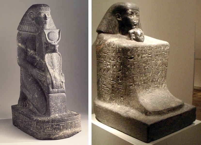 Fig. 4 – Una statua cubo di Senmut del Museo Egizio di Berlino mostra la testa della principessa Nefrura, figlia di Hatshepsut, spuntare dal manto di Senmut. Sulle spalle della statua di Senmut sono scolpiti due crittogrammi (fig. 5 e fig. 6) di cui Senmut si vanta affermando di avere inventato “immagini mai trovate negli scritti degli antenati.”