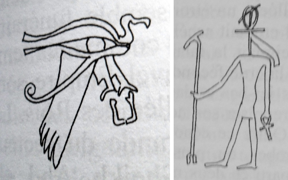 Fig. 6 – Sulla spalla sinistra l’immagine del crittogramma appare più laborioso. Un uomo stante al posto della testa ha i segni geroglifici ankh (vita) e was (potenza). L’uomo tiene in mano una canna con il segno was, nell’altra mano il segno è ankh. La testa nascosta sta per hat imen. Mettendo in ordine i segni gerolifici si legge “Hatshepsut è unita ad Amon.” La figura del crittogramma si trova nell’articolo di Drioton, Deux criptogrammes de Senenmout, ASAE XXX/1938, pagg. 231-246, tavv. XXX e XXXI, n. 1 e 2.