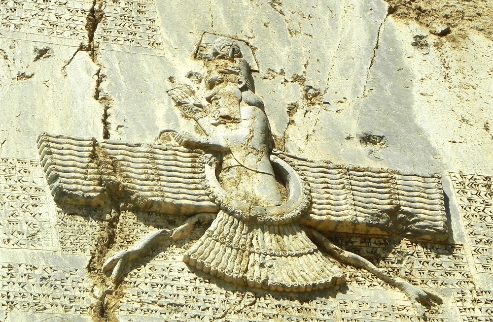 3) In Persia la religione ufficiale era quella predicata da Zoroastro che aveva come dio supremo Ahuramazda, il creatore dell’universo. Nel bassorilievo di Bisotun vediamo rappresentato l’angelo Fravashi. Questa figura rappresenta un’entità superiore che agisce come uno spirito guardiano o angelo custode che accompagna l’anima (urvan) di una persona durante la vita nel mondo materiale, guidandola verso il bene e aiutandola nella battaglia contro il male. Il Fravashi è rappresentato da un disco solare con una figura umana (faravahar).