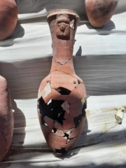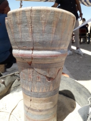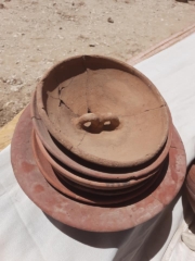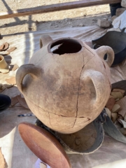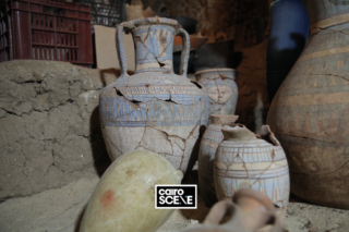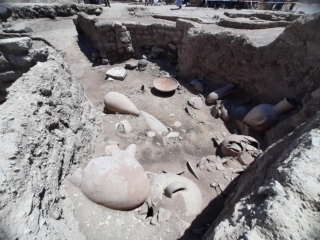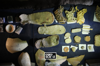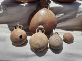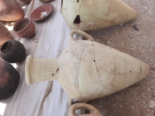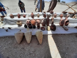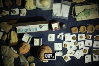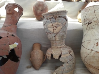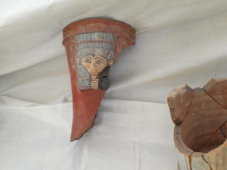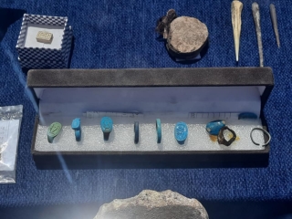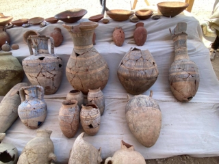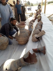 Tornando alla presentazione di ieri, gli splendidi oggetti emersi dalle sabbie erano stati esposti in vetrine appositamente allestite per l’occasione: anelli con i cartigli del prenomen di Amenhotep III (Neb Maat Ra) e della sua Grande Sposa Reale Tiye, gioielli, amuleti, sigilli, stampi e tantissimi oggetti di vita quotidiana. Le numerose ceramiche, appoggiate al terreno e senza alcuna protezione, si sono presentate con le loro eleganti linee di varie forme e colori; tra esse come non notare i fantastici vasi dipinti con motivi floreali e/o geometrici in azzurro (tipici della XVIII dinastia) e quelli con chiari riferimenti alla dea Hathor. Erano presenti anche tavole di offerta e persino un enorme pesce persico mummificato.