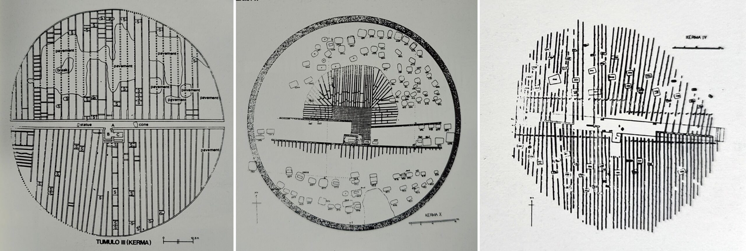 Le sepolture del Kerma Antico sono contrassegnate da una stele senza iscrizioni e da pochi bucrani che adornano la tomba. L’usanza dei bucrani si sviluppa nel Kerma Medio e in alcune tombe se ne possono contare fino a 400.