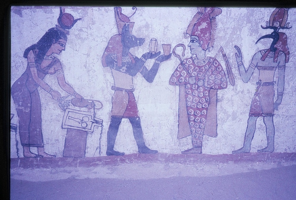 Appena sotto il soffitto il fregio di una vigna con tralci d’uva si svolge lungo tutta la tomba. Un riferimento indiretto al mito di Osiri, la sua morte violenta e la sua resurrezione.