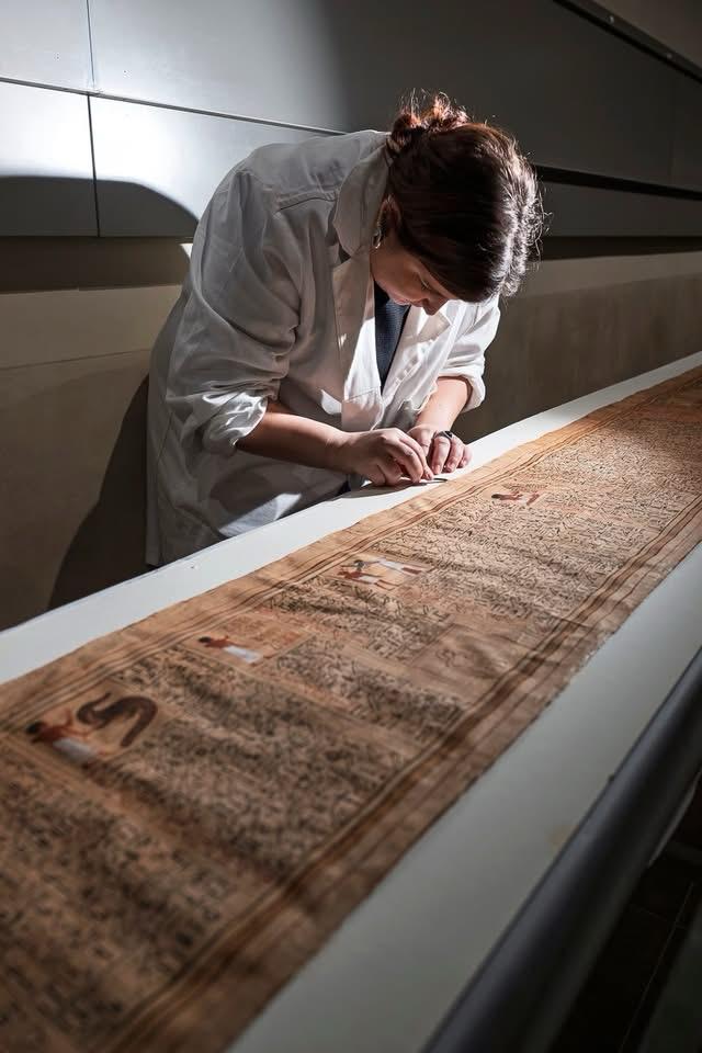 È stato implementato anche il sistema di anossia che sottrae l’ossigeno dalla teca così da proteggere il papiro da parassiti e insetti. Da sottolineare che il Libro dei Morti di Kha “è stato al centro di un importante intervento conservativo: dopo essere stato sottoposto a una pulitura a secco, è stato trasferito su una nuova carta di supporto, fissato con strisce di carta giapponese”. Accanto alla vetrina, una nuova infografica fornisce una lettura approfondita delle formule e dei significati, incorporando i risultati delle analisi scientifiche condotte con il CNR-ISPC. Le indagini hanno rivelato dettagli sorprendenti, come pigmenti, materiali e differenze d’inchiostro, testimoniando il processo artigianale e il significato culturale di quest’opera.