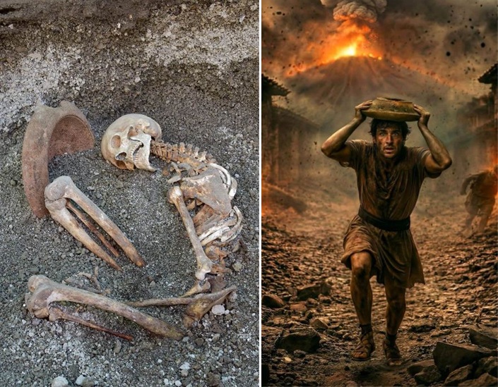 Accanto ai suoi resti è stato trovato un mortaio in terracotta, probabilmente usato come scudo improvvisato contro la pioggia di lapilli. Un gesto che sembra riecheggiare le parole di Plinio il Giovane, testimone oculare, che descriveva i tentativi dei fuggitivi di difendersi con oggetti di fortuna o cuscini legati alla testa.