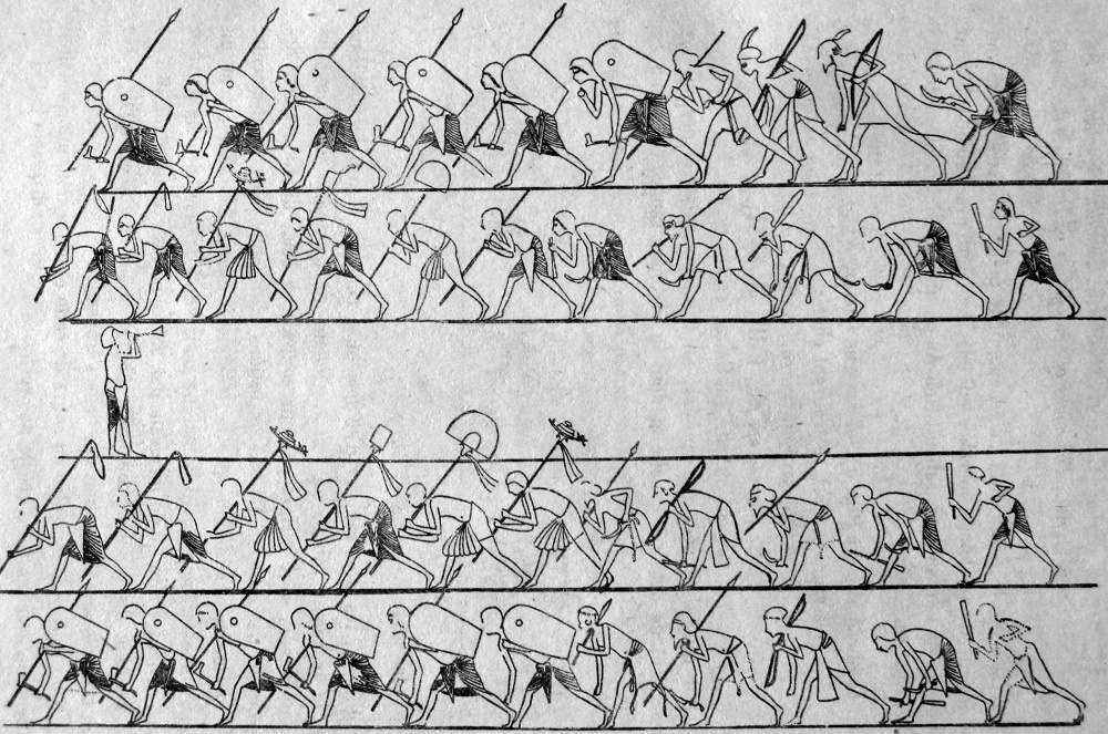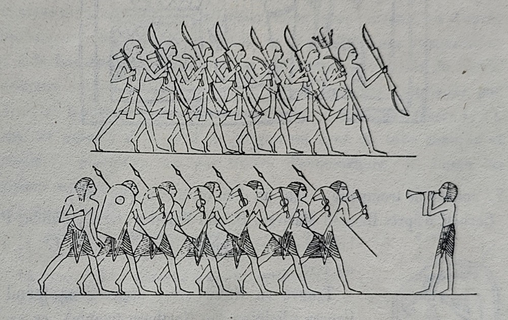 I testi consultati accennano all’uso della tromba in riti e processioni anche di tipo funerario senza corredare il testo di immagini documentabili5. In effetti non ho trovato nella documentazione disponibile nulla che provi l’uso della tromba in quadri che non siano di ambiente militare. Al contrario, la tromba è quasi sempre presente in quadri in cui sono rappresentati reparti militari.