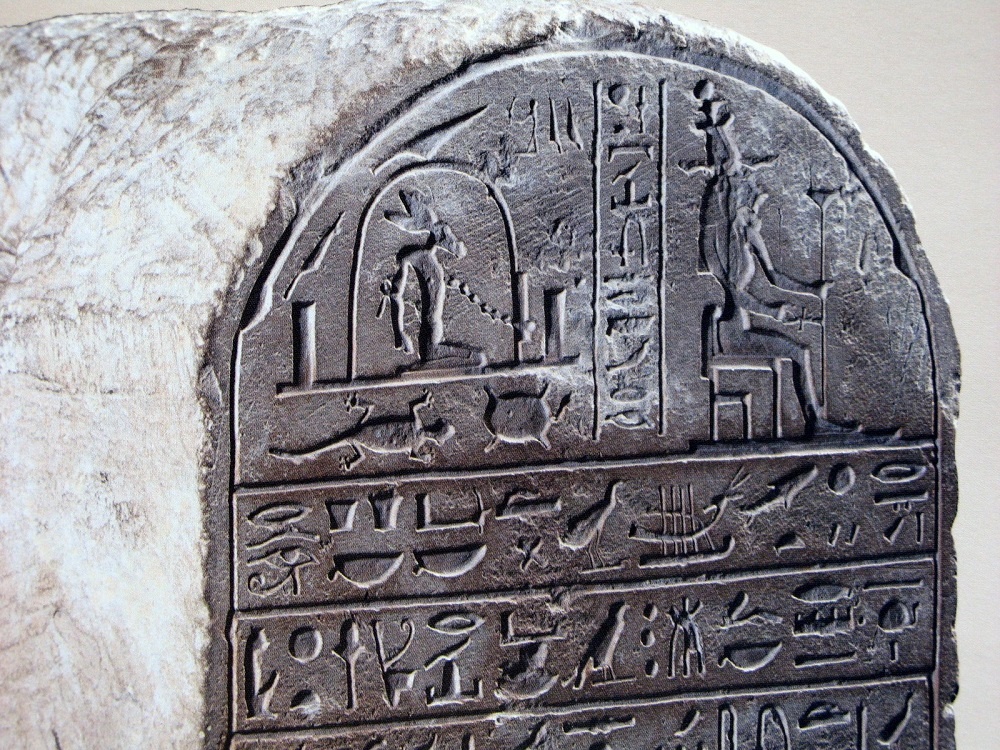 Una stele conferma il testo di Plutarco: nella parte superiore la stele mostra alcuni animali sethiani, ad esempio la tartaruga. Ma il vero soggetto della stele è un asino incatenato all’interno di un abitacolo a volta. Di spalle figura anche una divinità, Osiri, con in testa un’elaborata corona atef.