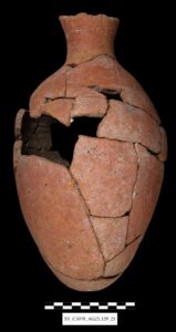 L’evidenza archeologica da noi rinvenuta – soprattutto la cultura materiale, e la ceramica in primis – ci dicono che circa cento anni dopo la morte di Nyuserra, il tempio cessò di essere utilizzato come luogo di culto e fu di fatto gradualmente riappropriato dalle comunità locali come un insediamento. La ceramica ritrovata (fig. 6) è di produzione locale e di scarsa qualità, evidentemente prodotta per uso domestico e non cultuale e si data con grande precisione far la fine della VI dinastia e gli inizi del Medio Regno, dunque, abbracciando in pieno quello che gli studiosi chiamano il “Primo Periodo Intermedio”, un periodo di crisi del potere centrale e di grande instabilità politica, ancora tutto da esplorare e non molto documentato nella necropoli menfita. Alla ceramica si associano inoltre molti oggetti di vita quotidiana come i pesi da telaio o persino le due pedine in legno del gioco del senet (fig. 7), uno dei ritrovamenti più suggestivi fatto dalla missione nel 2024. Il santuario divenne insomma un’enorme area abitativa, dove per la prima volta quello che emerge sono le vite degli egiziani comuni della fine del III Millennio a.C.