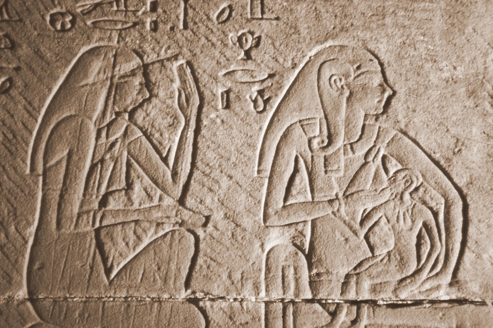 Fig. 18 – In questa scena la dea Hathor tiene in grembo un infante. Dietro di lei c’è un toro alato