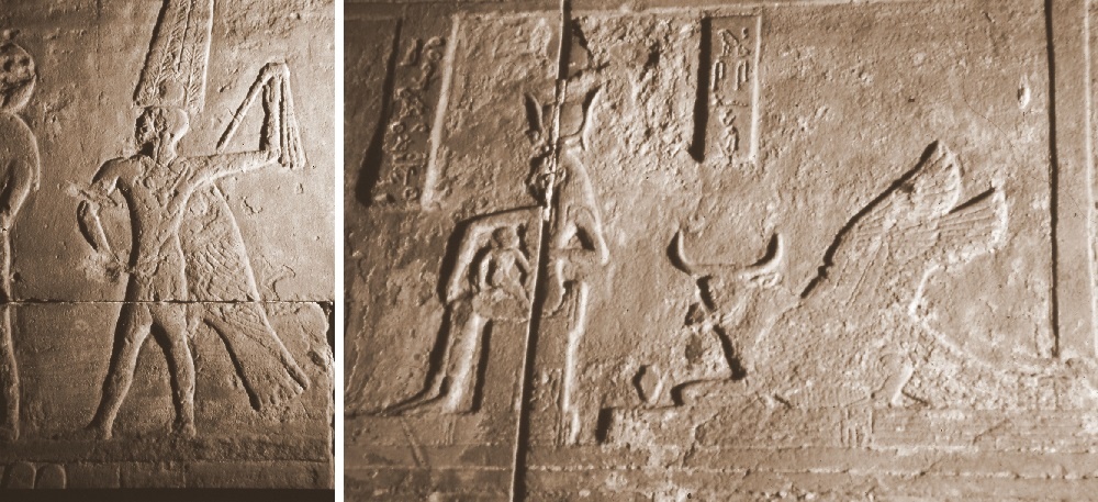 Fig. 6 – In una parete della sala colonnata un dipinto mostra il re persiano Dario I nel rito di scuotere i papiri, un rito che richiamava la dea Hathor e la sua protezione