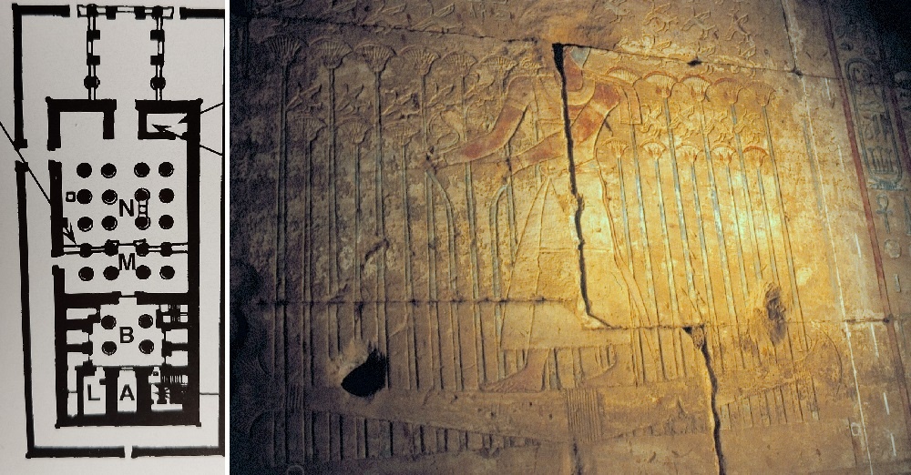 In fondo alla sala colonnata (20 colonne), sulla destra, compare una famosa e curiosa immagine: il dio Seth combatte con la lancia contro un enorme serpente, Apopi.