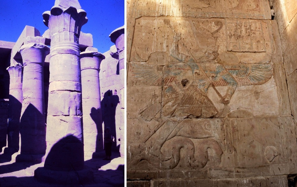 Fig. 8 – In fondo alla sala colonnata, a destra, la scena dipinta mostra il dio Seth, grande di forza, che combatte e colpisce con la lancia un enorme serpente, il malvagio dio Apopi. Questa scena è datata al regno di Akhoris (XXIX dinastia)
