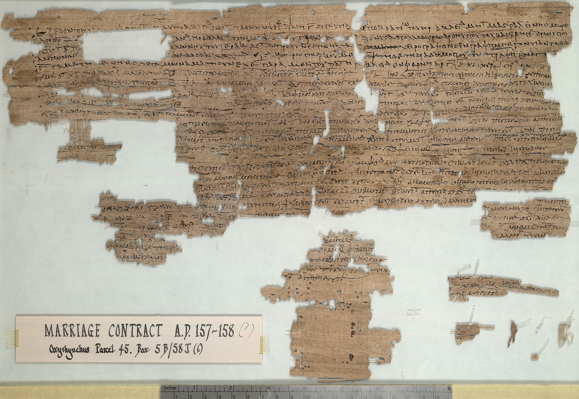 Sources: Oxford Papyrology (2022). P.Oxy. XLIX 3491. Marriage Contract. University of Oxford. ; Papyri.info; Egypt Exploration Society.